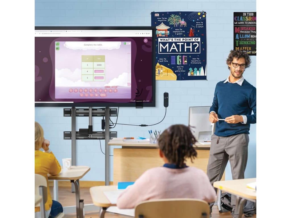 This height-adjustable wall-mounted flat panel is important for the classroom because it not only saves valuable classroom floor space but can also accommodate students with different physical abilities and needs. Its easy-to-use electric lift allows the flat panel height to be adjusted with a 17” range to accommodate students from different grade levels as classrooms change. Cords and support legs are concealed with a frame cover. There is a built-in clearance for mounting over marker ledges on whiteboards. This flexibility is also ideal in media and library spaces where many students participate in activities.