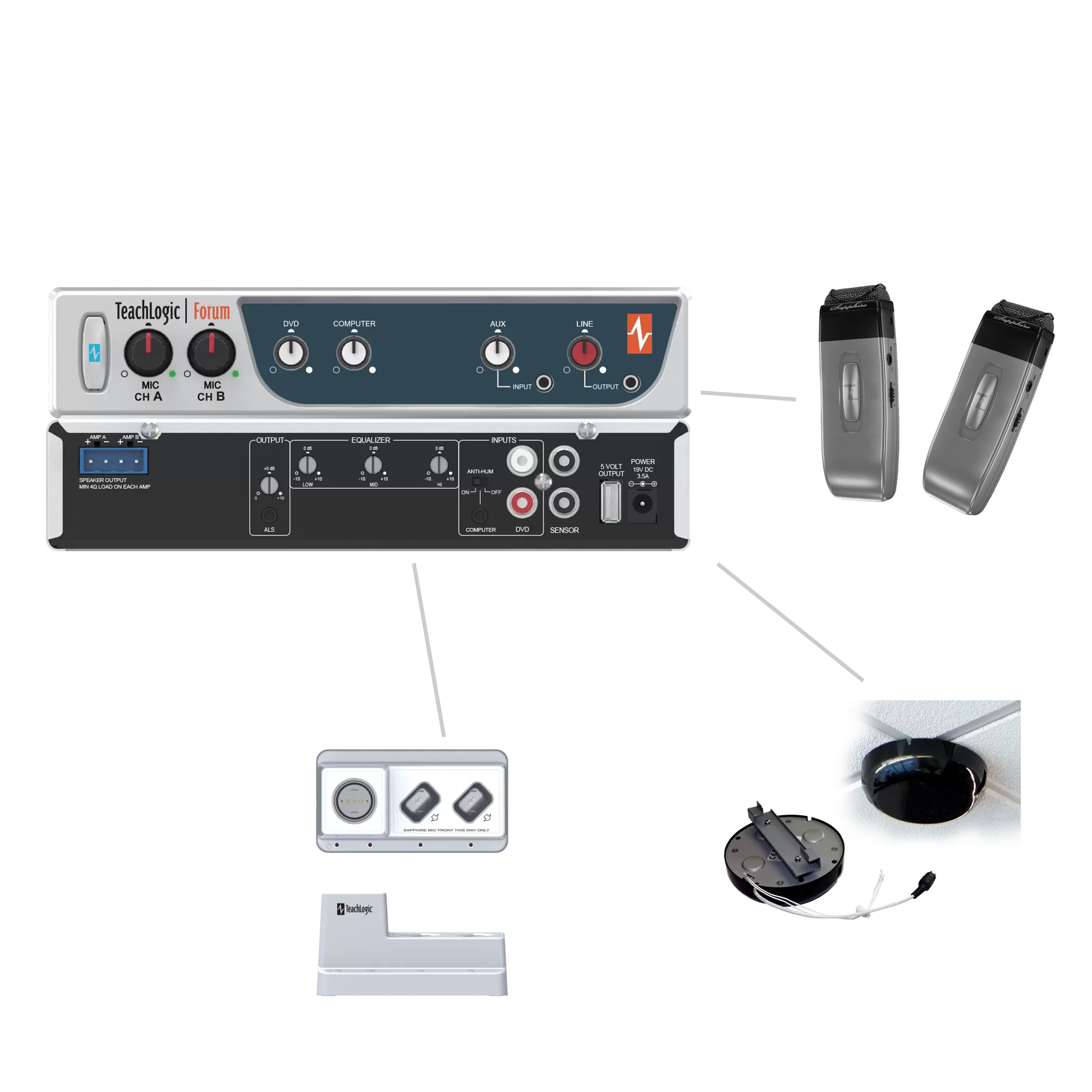 The TeachLogic Forum™ instructional audio system provides the classroom with a platform to clearly deliver all audio sources so that learning happens regardless of where the students are located. This versatile system supports 2 infrared wireless microphones, 3 classroom audio sources like a computer or TV, and 2 audio outputs for assistive listening system connection, lesson capture recording, and/or video conferencing to support hybrid learning models.